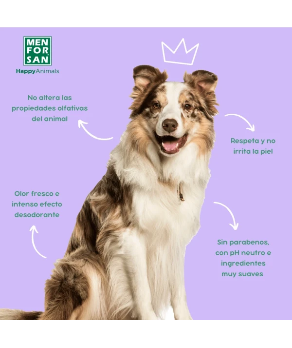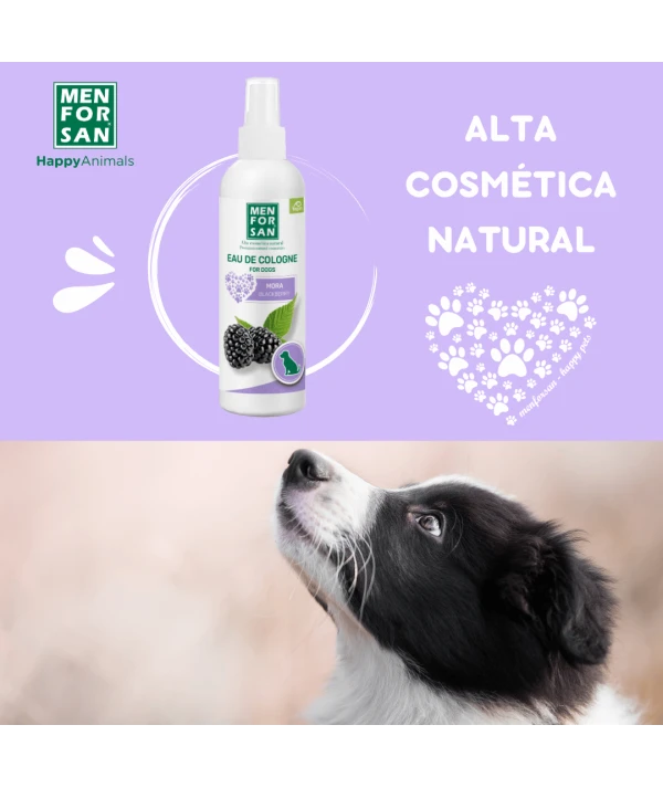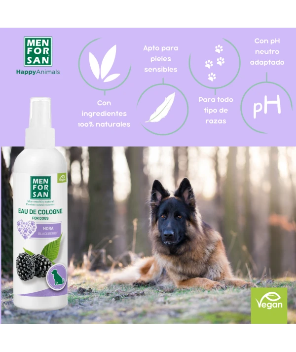 Agua de colonia para perros con fragancia a MORA especialmente creada para proporcionar después del baño un olor fresco y un intenso efecto desodorante muy agradable respetando la piel y las propiedades olfativas del animal. No contiene alcohol y tiene pH neutro careciendo de efectos irritantes y evitando que el perro estornude después de su aplicación.