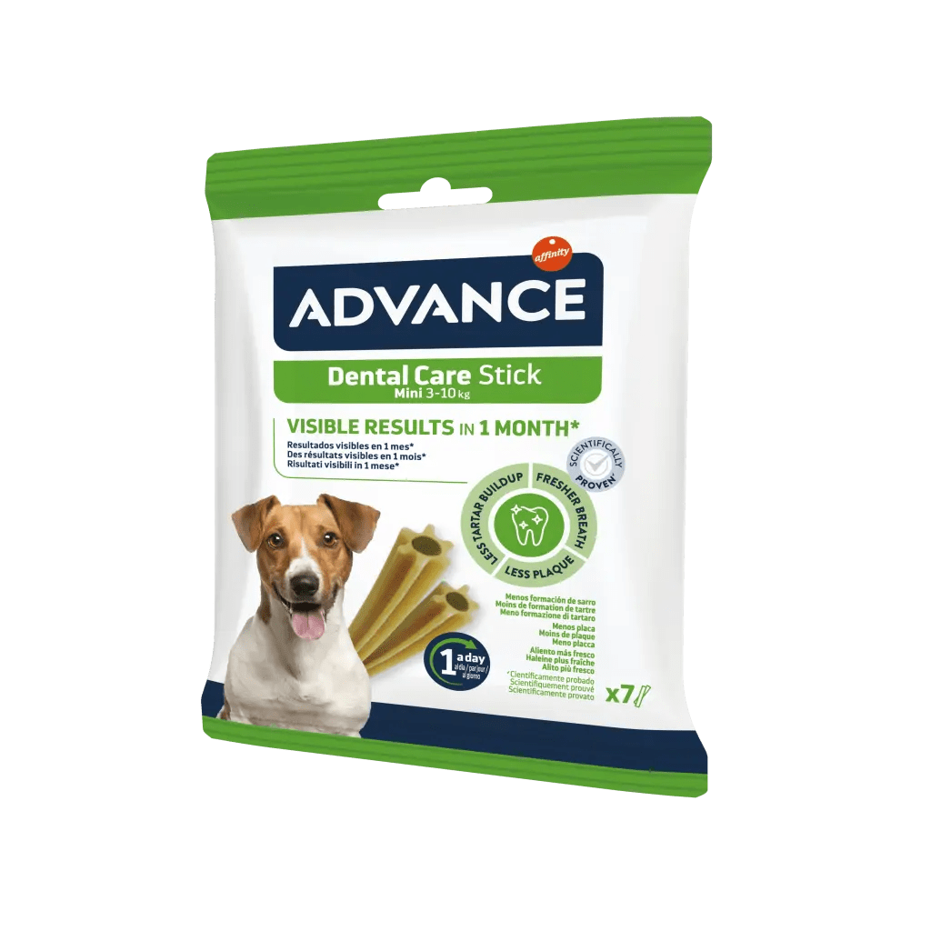 ADVANCE Dental Care contiene una fórmula exclusiva, con un triple efecto para el cuidado dental de tu perro mini, con resultados demostrados clínicamente: en 1 mes*, el 94% de los perros reducen la formación de sarro, 82% de los perros reducen la acumulación de placa, y el 65% de los perros tienen un aliento más fresco. El stick, adaptada al perro mini, tiene una forma especial que ayuda a eliminar los residuos de comida de los dientes de tu perro. * Estudio científico. Aliento más fresco: menor cantidad de compuestos volátiles de sulfuro comparado con los mismos perros que no comieron Advance Dog Dental Care Stick .