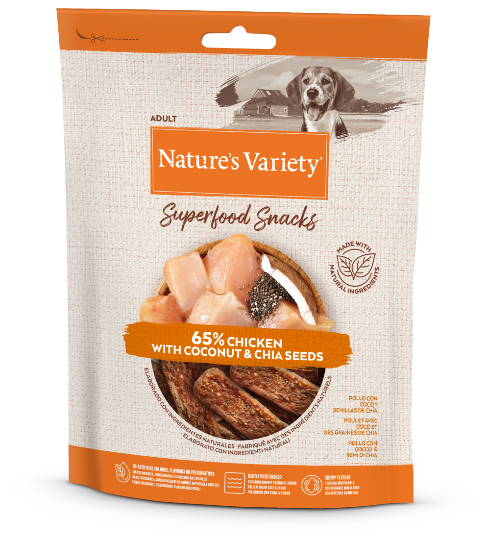 Ingredientes: Pollo* (65%), proteína de guisante*, glicerina vegetal, semillas de chía* (4%), vinagre blanco destilado, coco deshidratado* (2,28%, equivalente a un 4% de coco fresco), sal, boniato deshidratado*, semillas de lino*, espinaca deshidratada*, tomillo*, aceite vegetal*., *Ingredientes naturales.